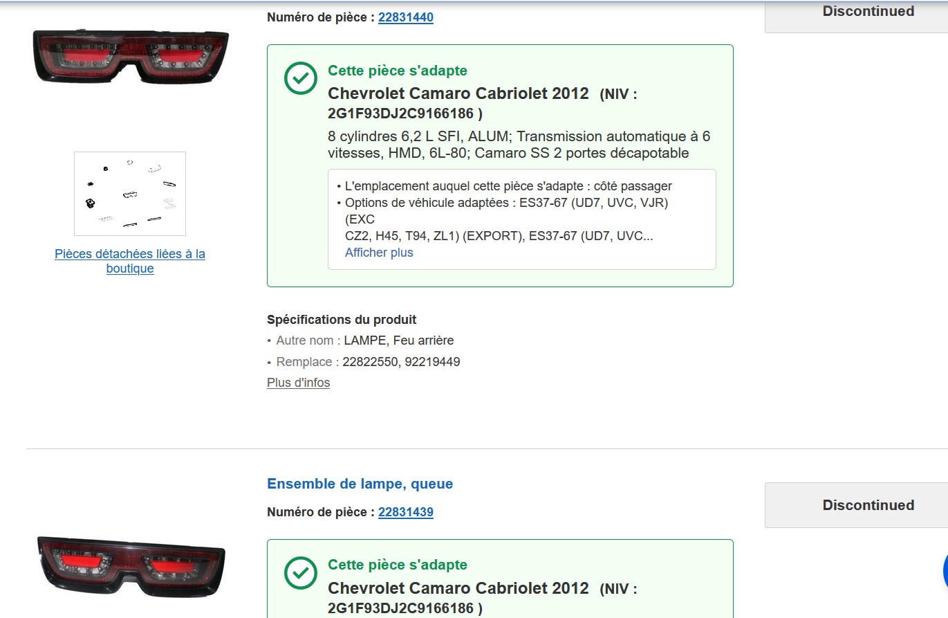 Quand on teste la compatibilité avec le véhicule, le retour est que ça ne correspond pas à la voiture. Pourtant ça y ressemble, mais le P/N est différent: celui-ci est 22829424 alors que celui d'origine est 22831439.alanbike a écrit : ↑08 nov. 2024, 15:01 Même sur le site que j'avais trouvé aux US , ça a bien augmenté![]()