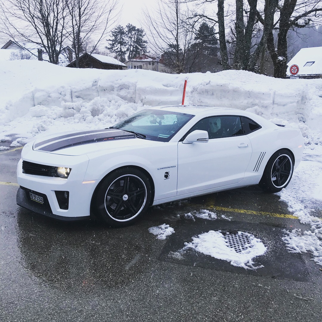Modele : Coupé BVA 6.2 SS blanche bandes noires "Corsica" 2013, bouclier avant ZL1, optimisation Hartt Racing, K&N Typhoon, Borla S-Type, H&R -4cm, DLW Uros K-S 9.5 et 10.5", Phantom grill.