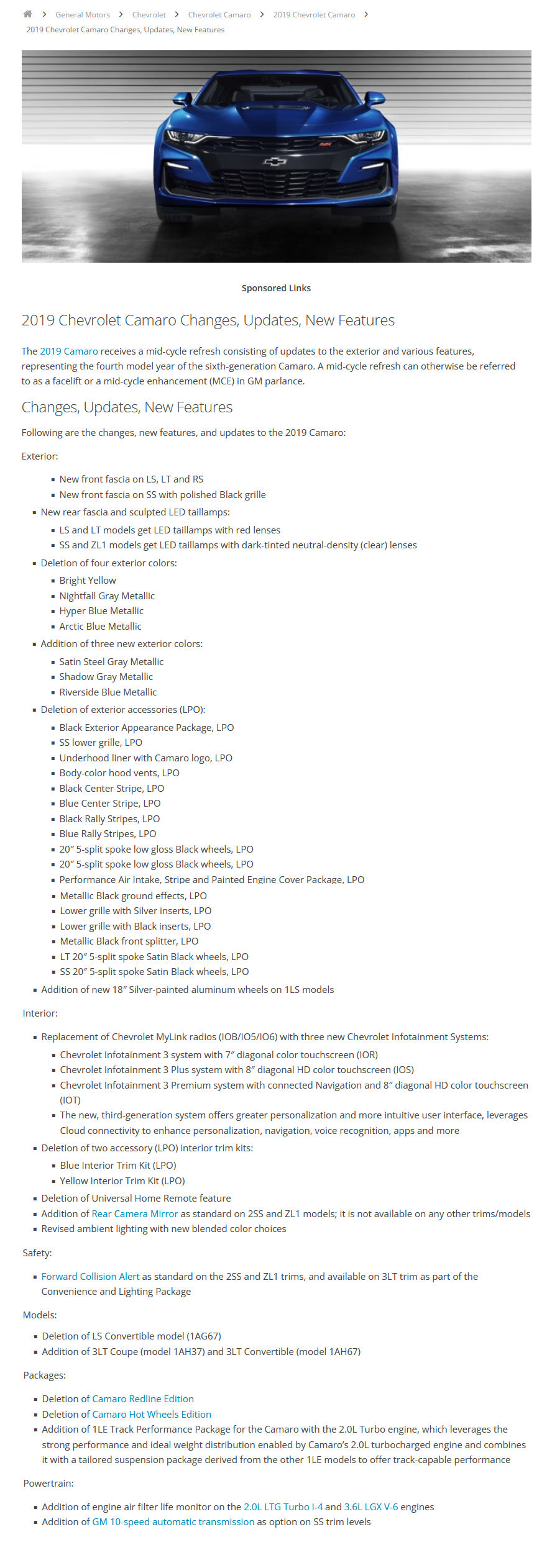 - Modele : CAMARO LT 2,0 L TURBO 2018