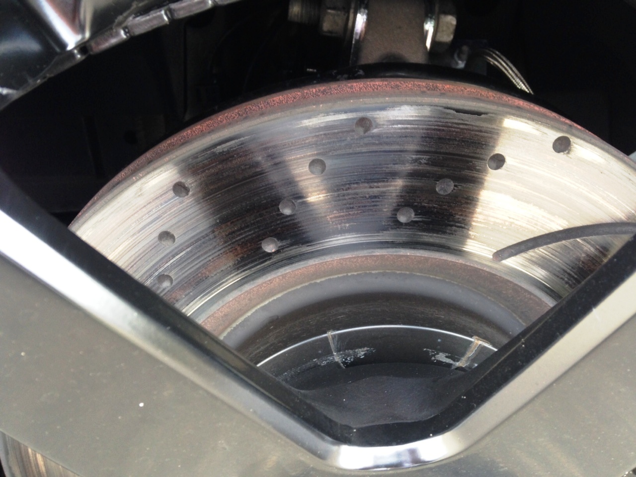 Constat: Les disques ont bien morflées et présentes de grandes stries (rainures), de plus ils sont déjà légèrement voilées (vibrations présentes lors de freinages appuyés). Usure plaquettes AV: 3/4. Ils auront pas tenu longtemps... :( :? :doh: (Cf. photos).