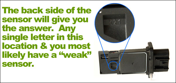 It is very simple. Remove the MAF sensor from your intake tube and take a look at the code inside the indented window. Any single letter MAF is "weak" and any MAF that features a letter followed by a number like the one in the picture below is "strong".