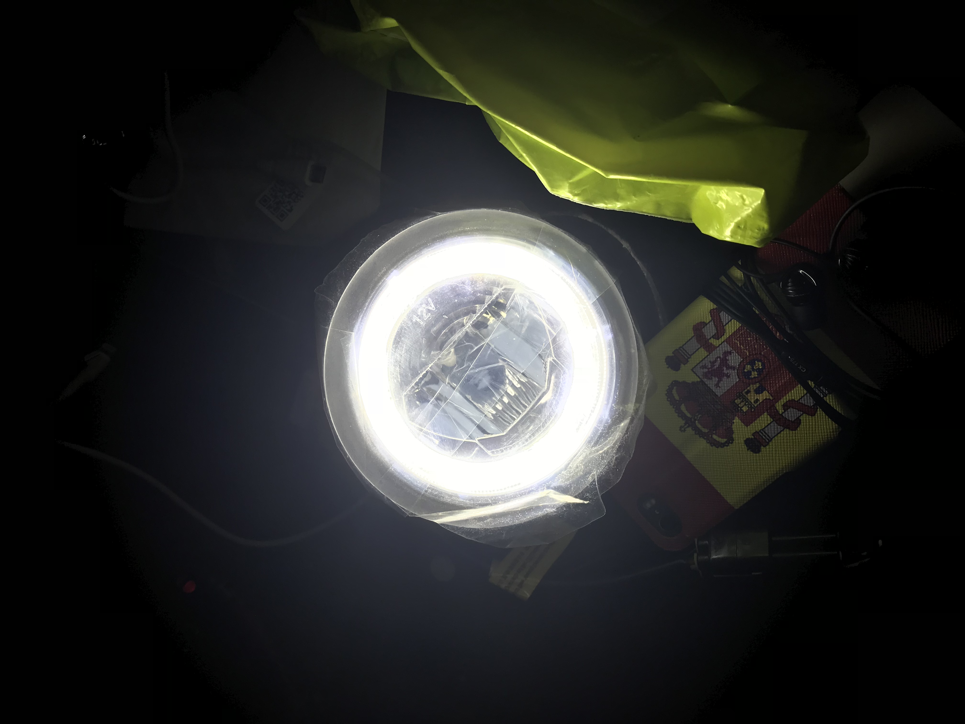 Petit retour au sujet de kit Halo Harness, comme ça, je ne voit vraiment pas où se situe le problème hormis éventuellement de les brancher sans les boîtiers anti-erreur fournis, car en effet, j’ai été les chercher ce matin à La Poste et me suis tout de suite attelé à les brancher sur une alimentation 12V selon l’ordre de connexion normal, donc en passant pas le-dit boîtier, ils fonctionnent du tonnerre de Dieu et je peux dire sans me tromper que la partie centrale est un anti-brouillard vu la puissance qu’il crache et surtout il éclaire à l’horizontale en direction du sol, les fdj sont donc les Halo qui doivent au moins éclairer autant que les ampoules à LED blanches que la plupart des membres du forum ont installés, je mettrait en fin de post des photos du rendu halo seul, anti-brouillard seul et les deux modes allumés ensemble.
