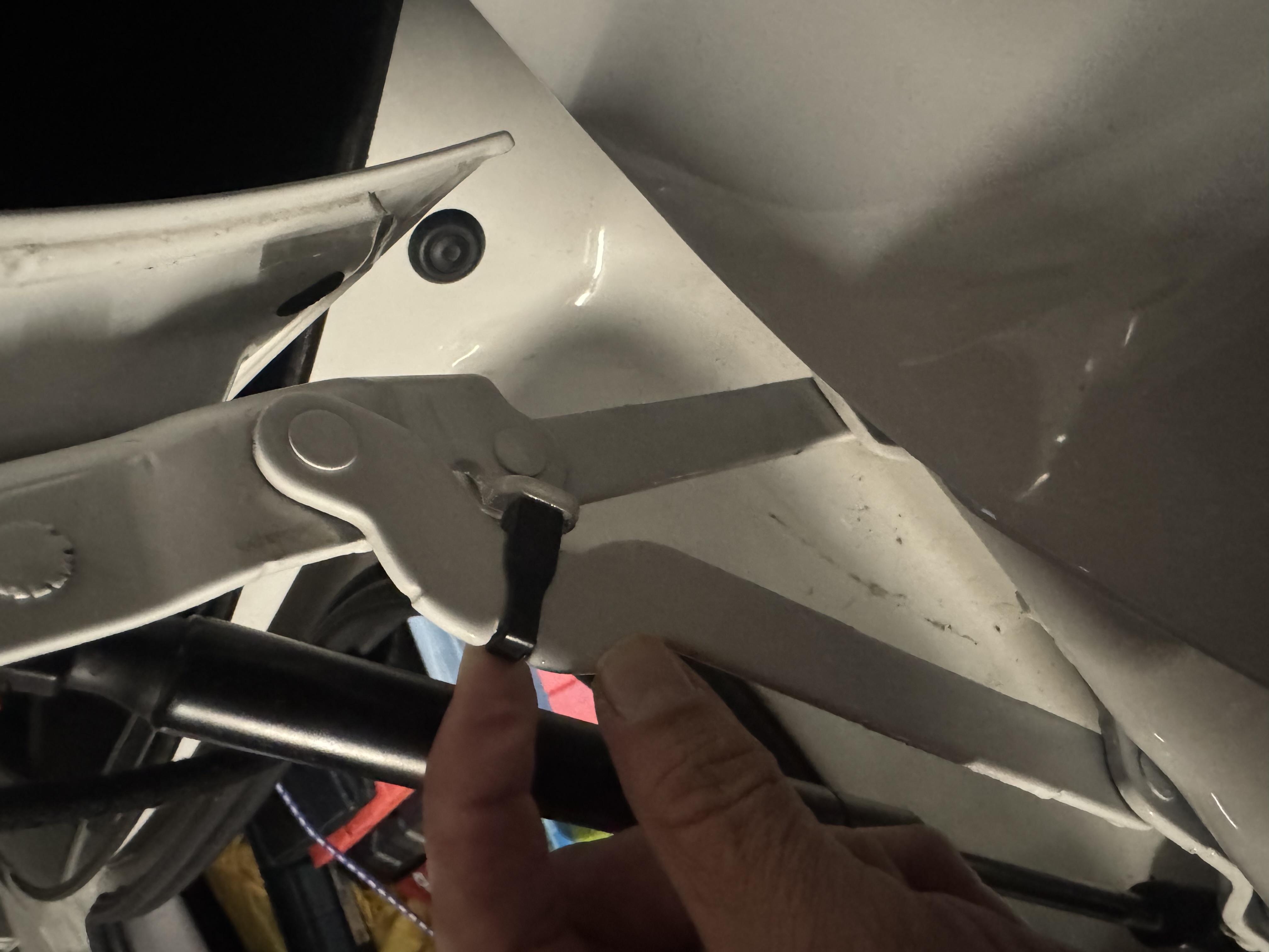 Ouf, c’était bien ça, il fallait enlever les clips de retenue et pousser un peu sur le coffre pour que les vérins entrent, ne pas oublier de remettre ces clips, ça évite je pense que le bras se déforme à la longue en cognant métal contre métal.