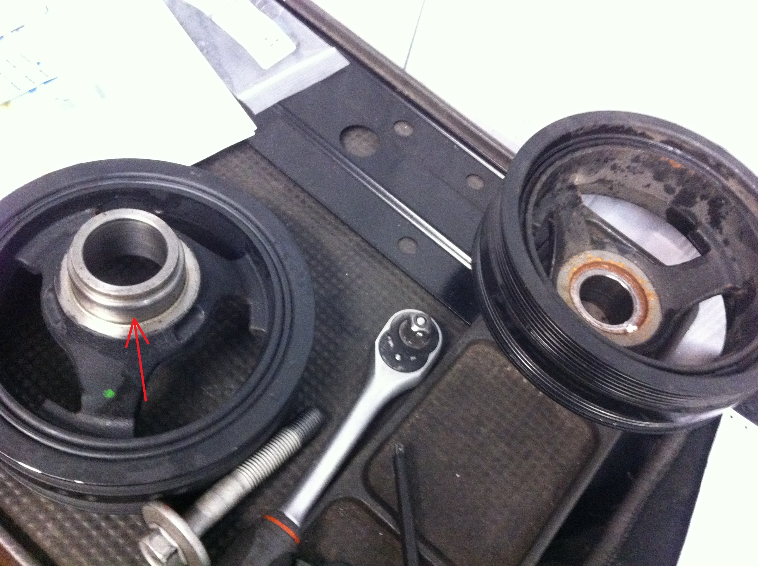 les poulies sont différente lors du remplacement la hauteur de ce morceau de la pièce ( flèche en rouge ) n'ai pas la même que sur l'origine.