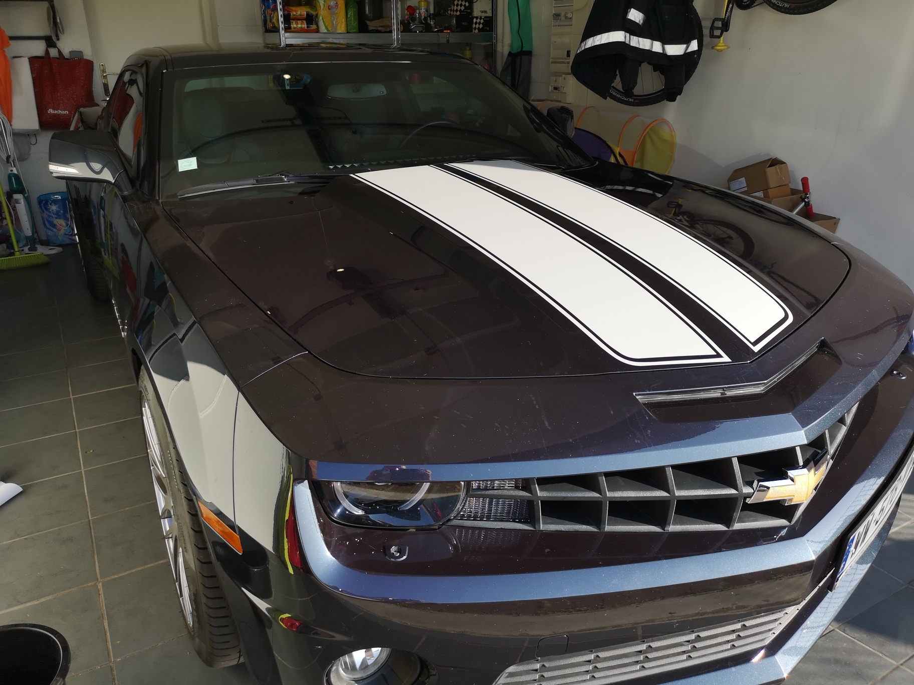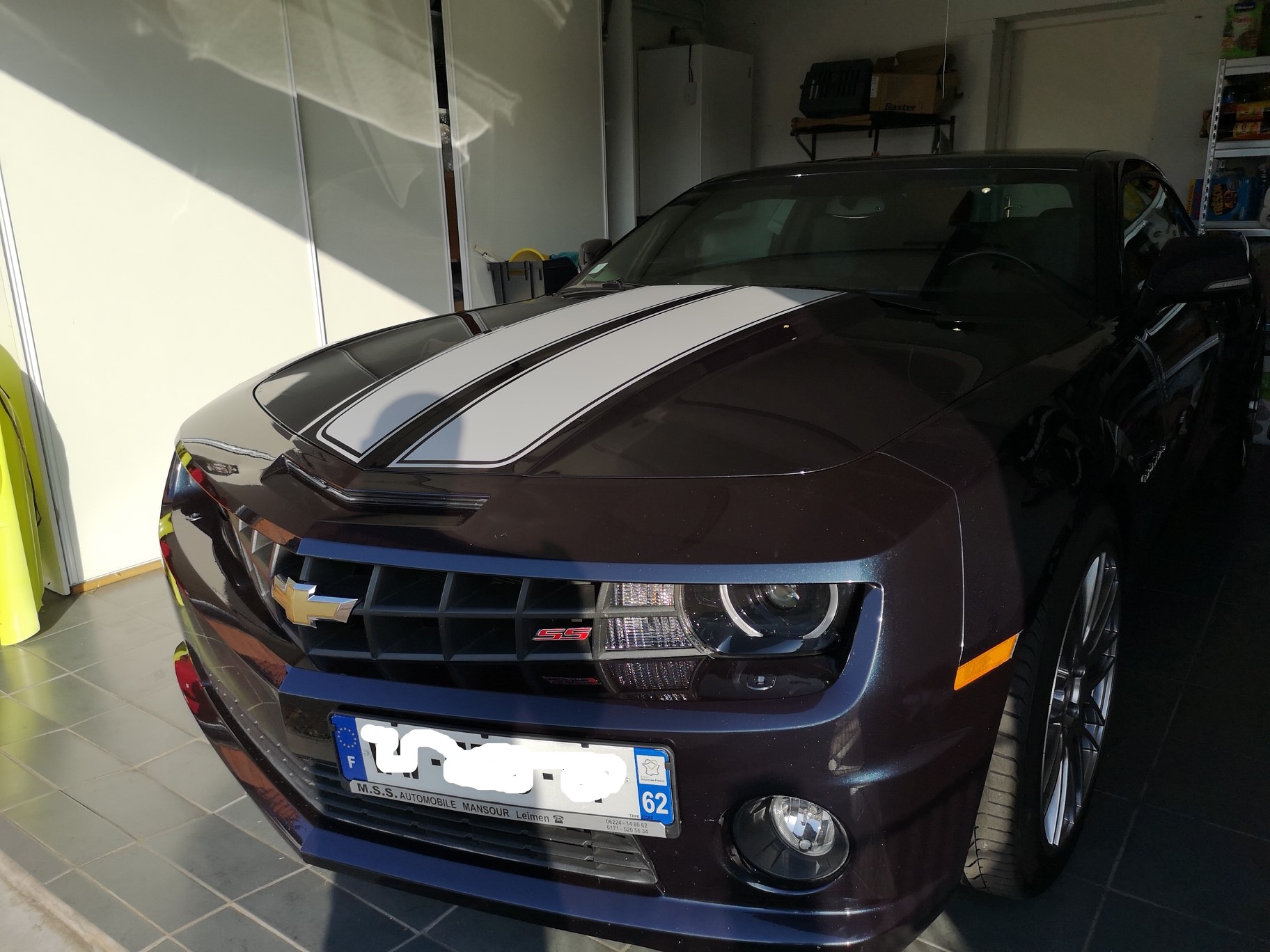 Modele : Coupé BVA 6.2 SS blanche bandes noires "Corsica" 2013, bouclier avant ZL1, optimisation Hartt Racing, K&N Typhoon, Borla S-Type, H&R -4cm, DLW Uros K-S 9.5 et 10.5", Phantom grill.