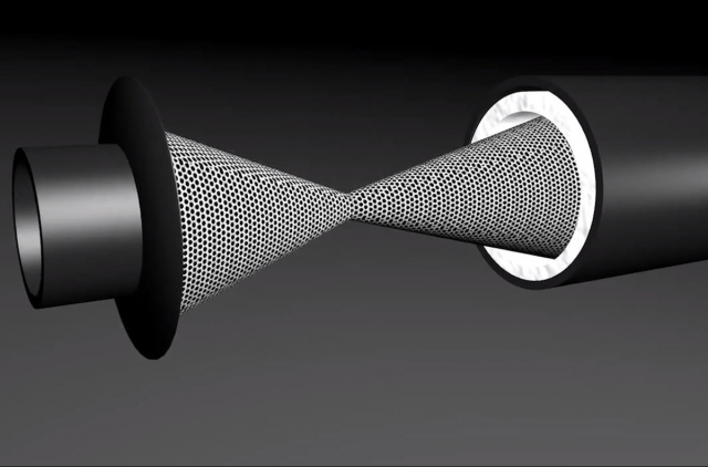 Flowmaster’s laminar flow muffler design forces the flow through two conical shaped perforated tubes before exiting the muffler. Flowmaster’s Nick Tauber explained the technology by saying, “These mufflers use what we call broad band sound cancellation. The sound waves expand to the outer core of the muffler where the sound waves are cancelled out similar to one of our chambered mufflers. Residual sound waves are then absorbed by the outer thermal barrier which also helps dissipate radiant heat. As the exhaust pulse enters the muffler its velocity is increased using the venture effect. The increased speed of the exhaust pulse creates a low pressure area behind it. This creates the scavenging effect. This type of technology also works very well in turbo applications.”